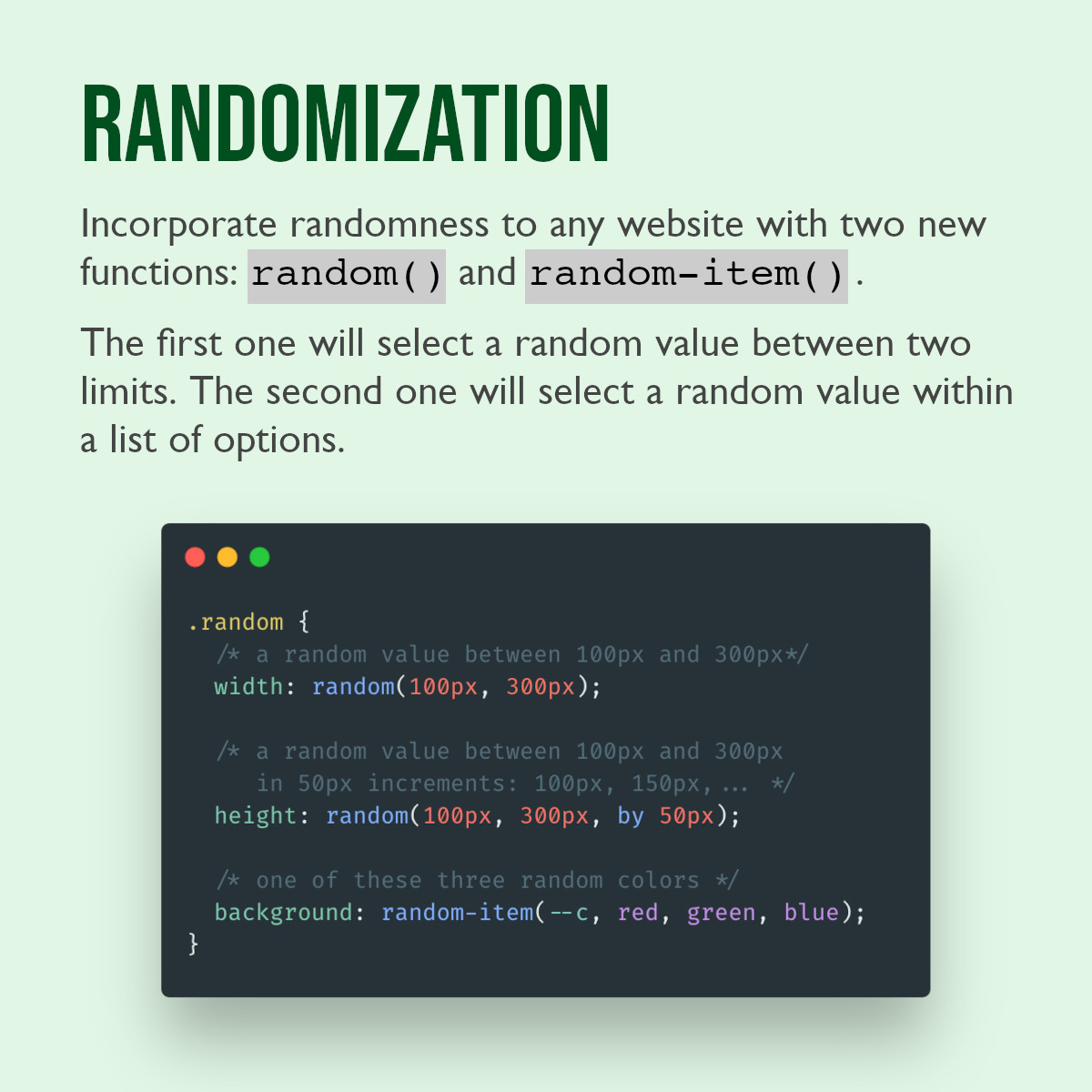 Fun designs have some level of randomization, something that was missing in CSS. But this module introduces two new functions that return random values from a list (random-item()