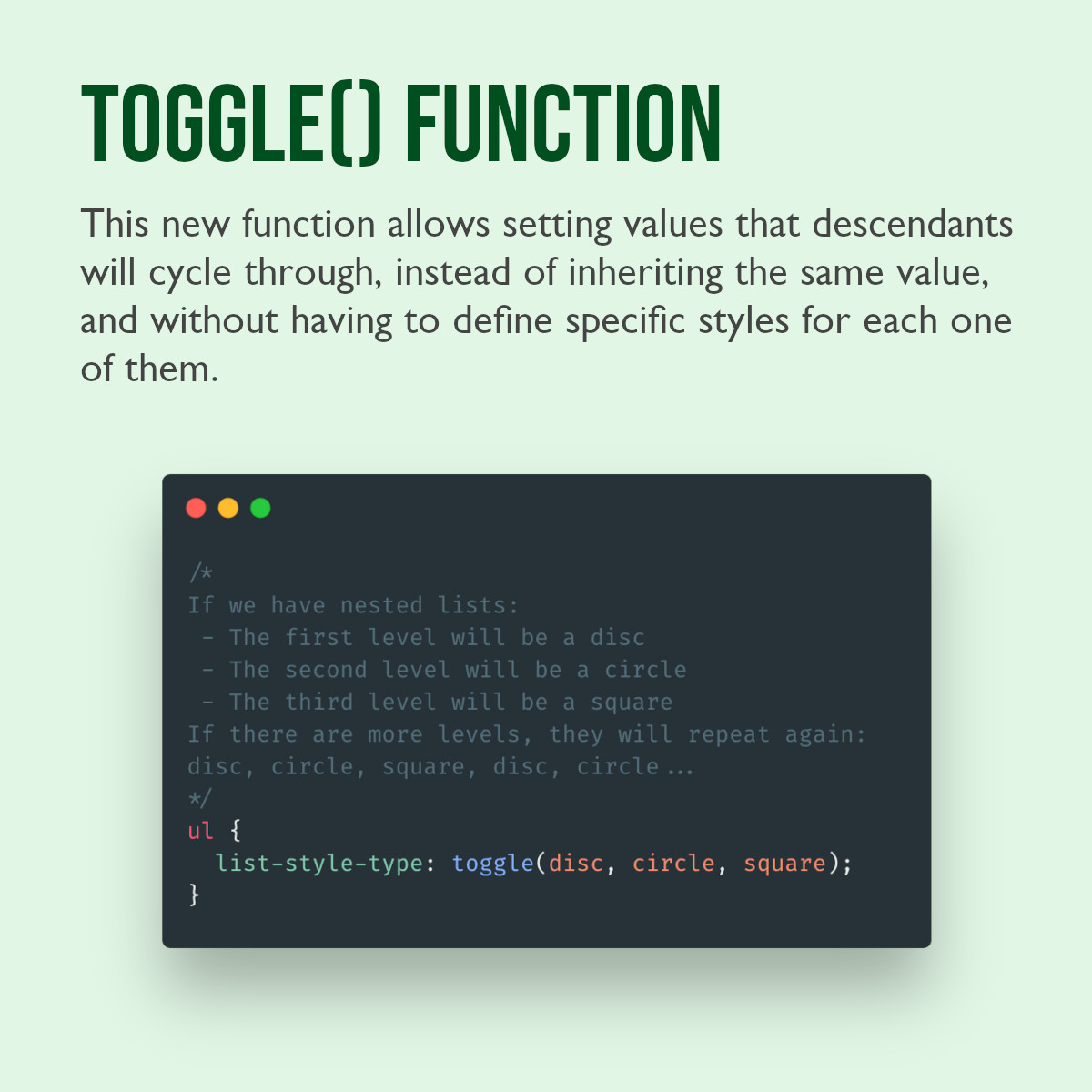 function sets values that the element and its descendants will cycle through, simplifying the code considerably. Forget about complex rules or redefinitions — everything will be in a single line of code.