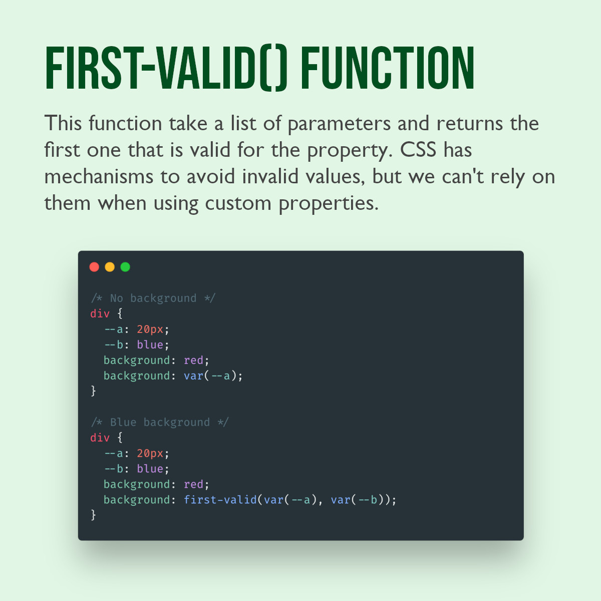 function: use intrinsic values such as auto or min-content in calculations.- New first-valid() function to avoid issues with custom properties with invalid values.