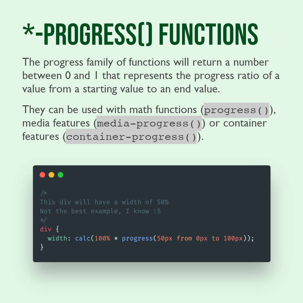 - New *-progress() family of functions to calculate the progress ratio between a range or within a media or container.