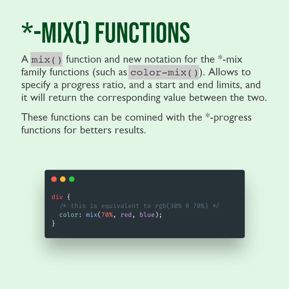 , that can be used to simplify the different *-mix functions. Do you want to mix colors? You could do something like color-mix(red 60%, blue)